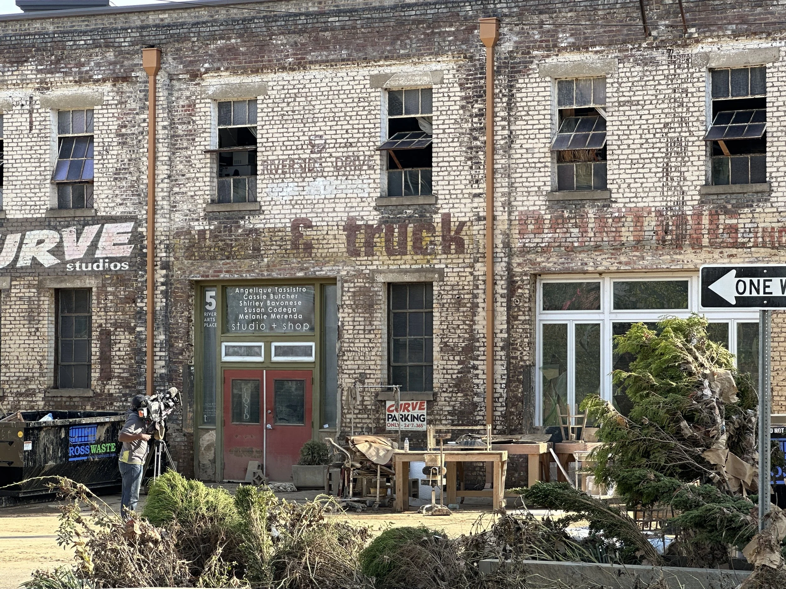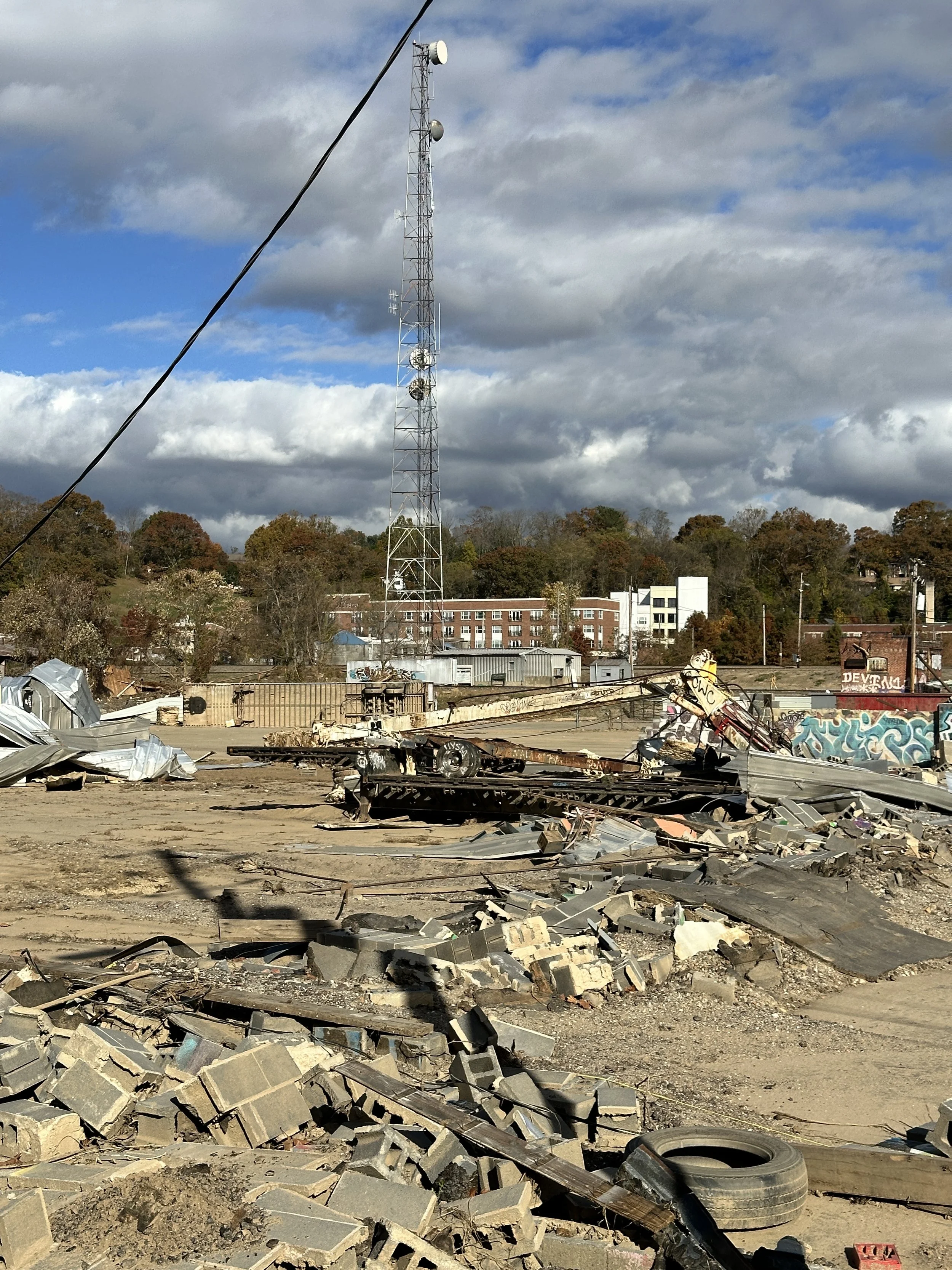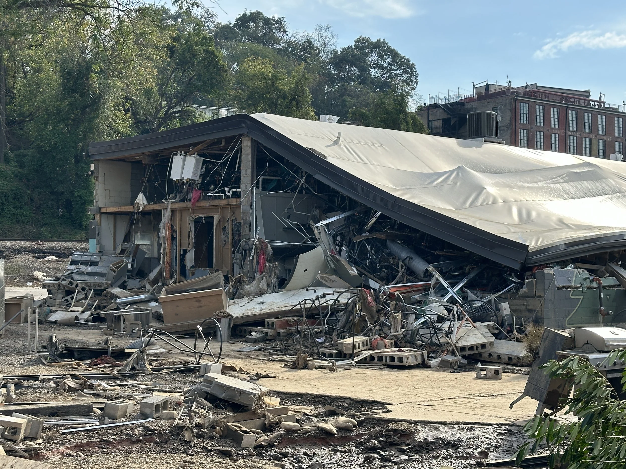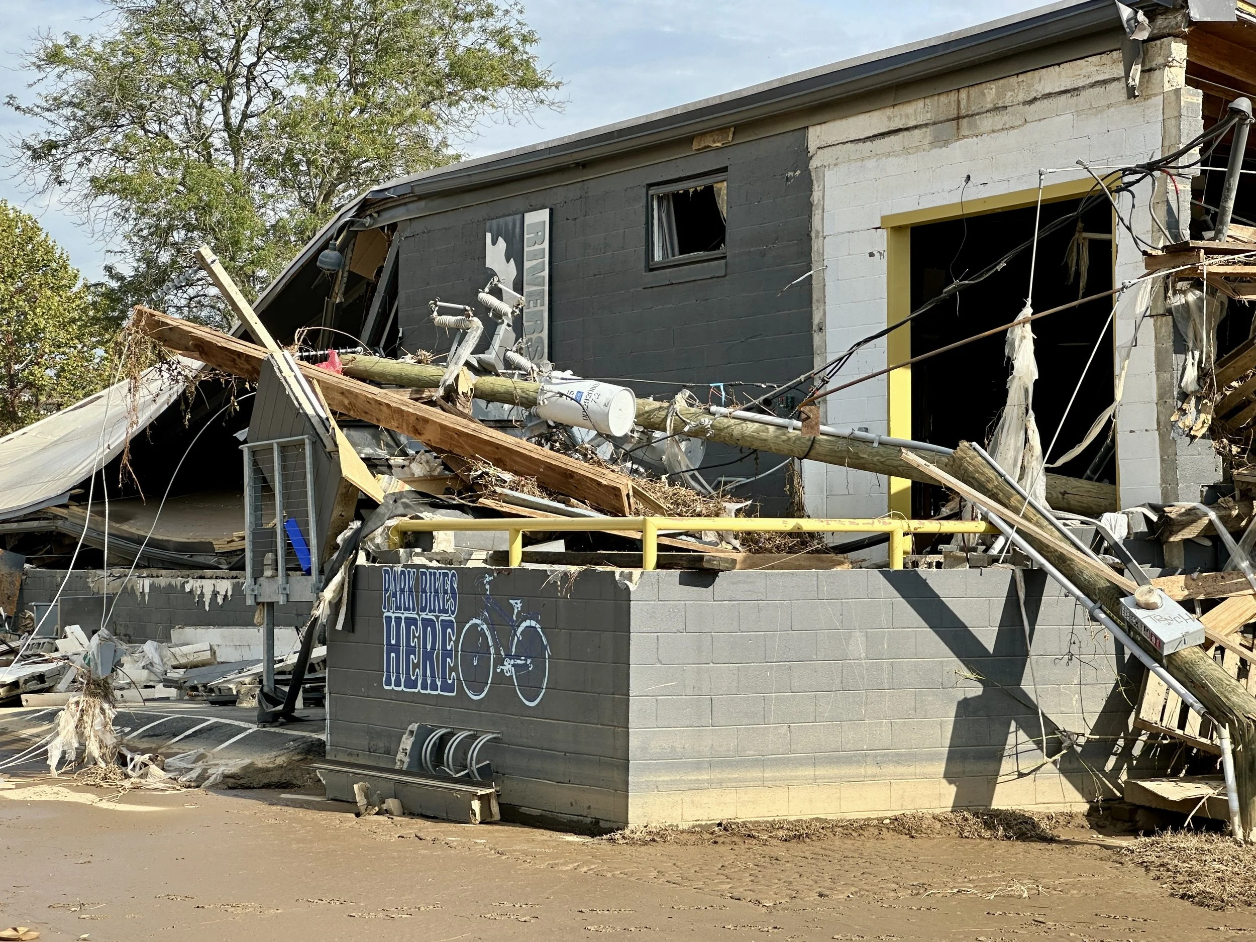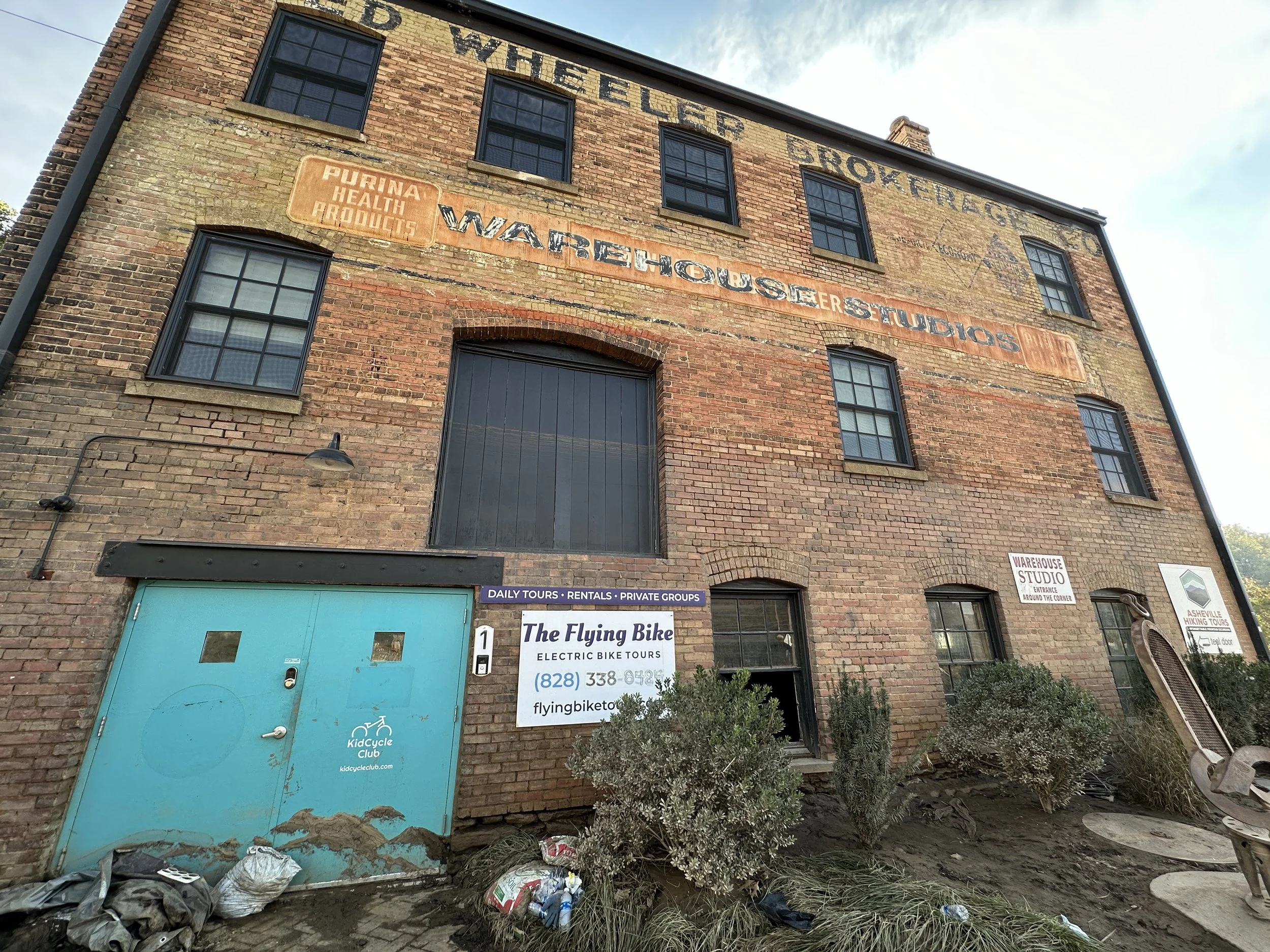 River Arts District after Helene. Second Gear was eventually torn down to foundation a year after the storm and will now be an outdoor skating rink.