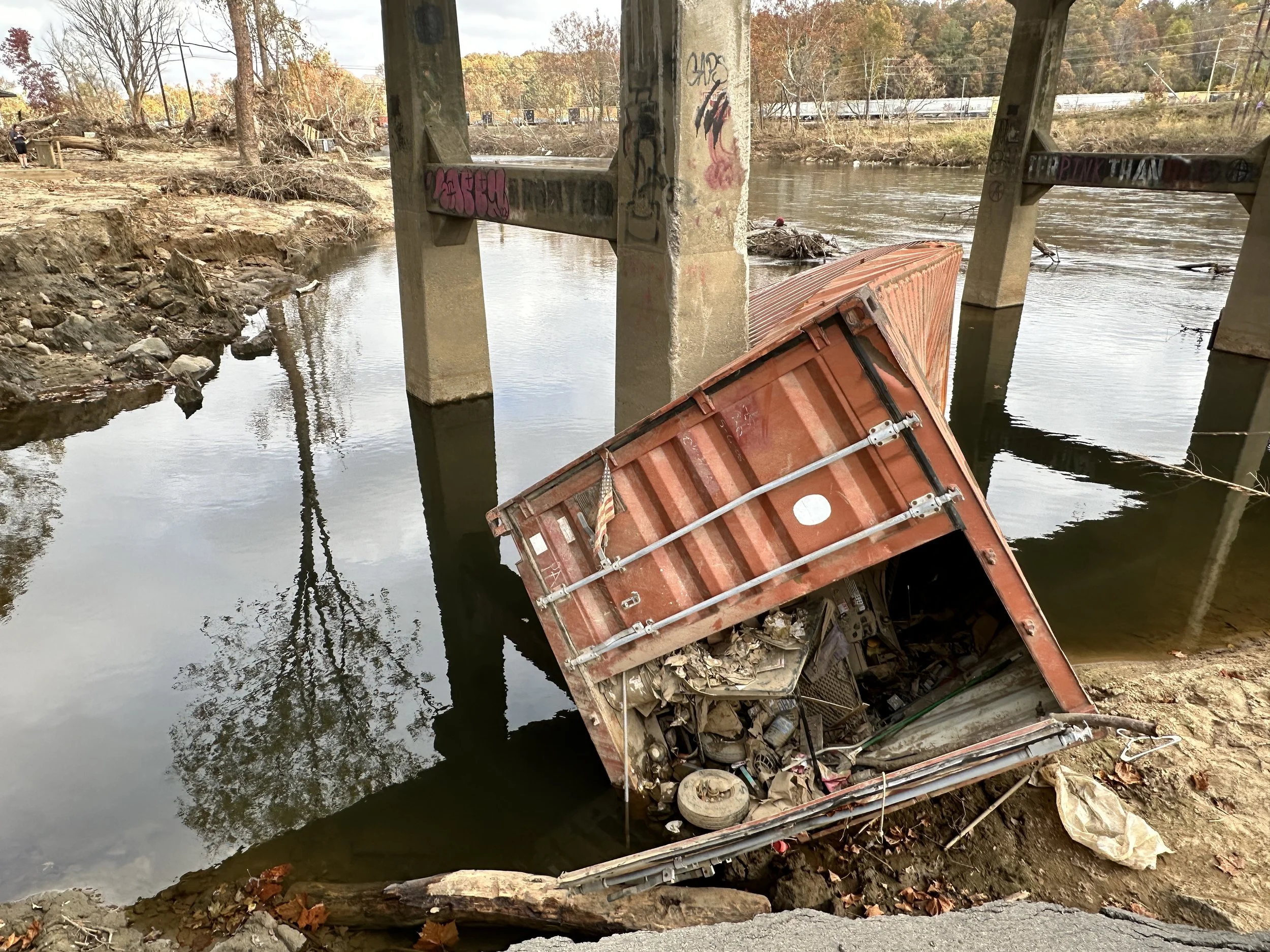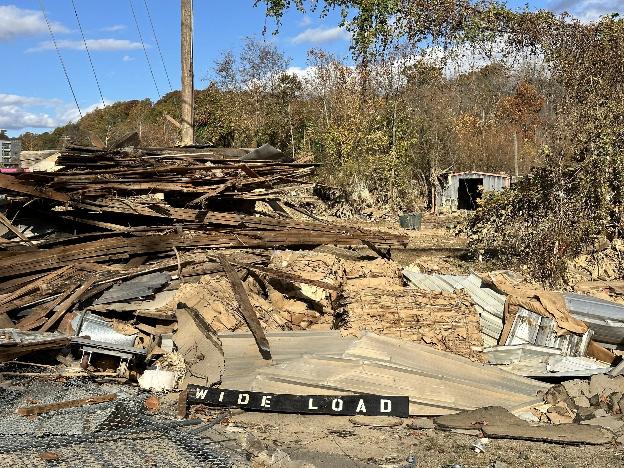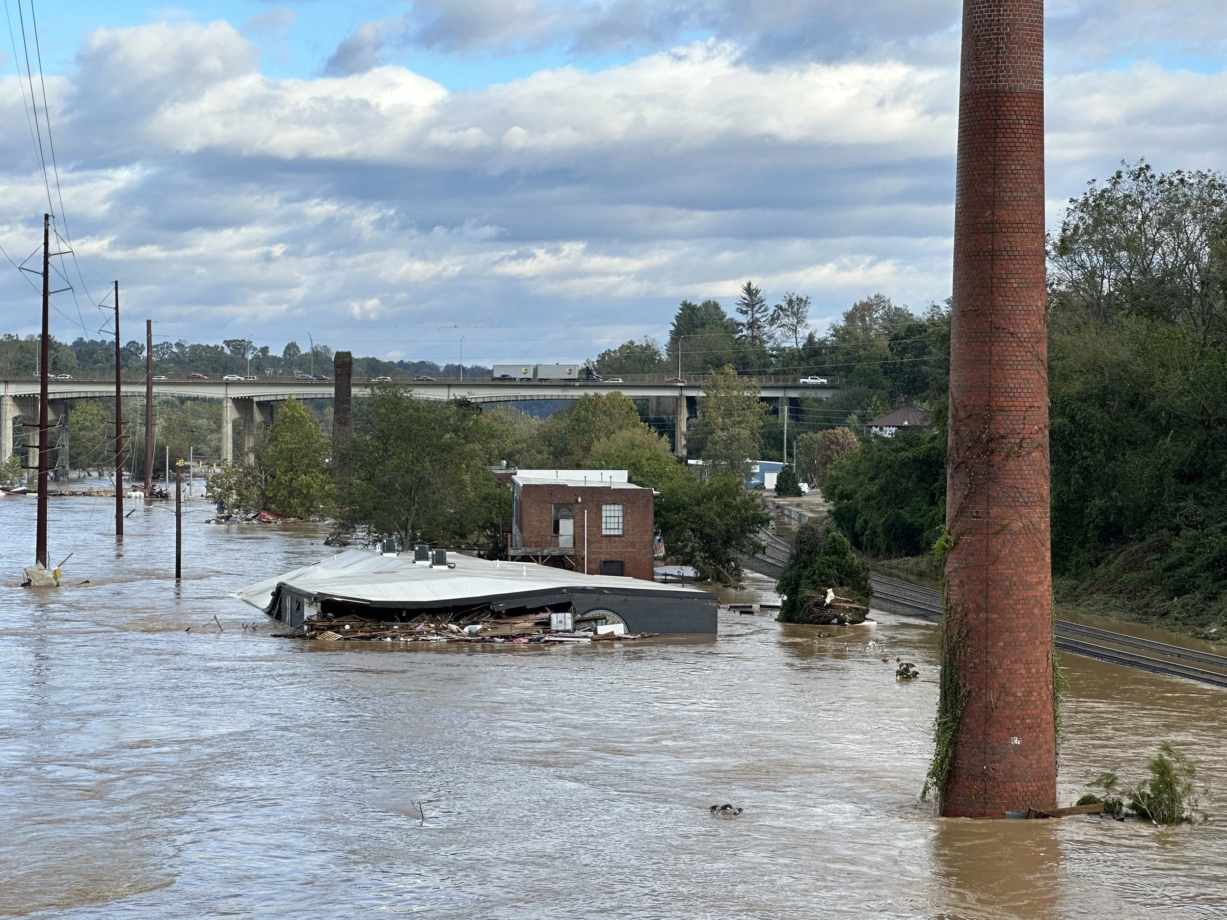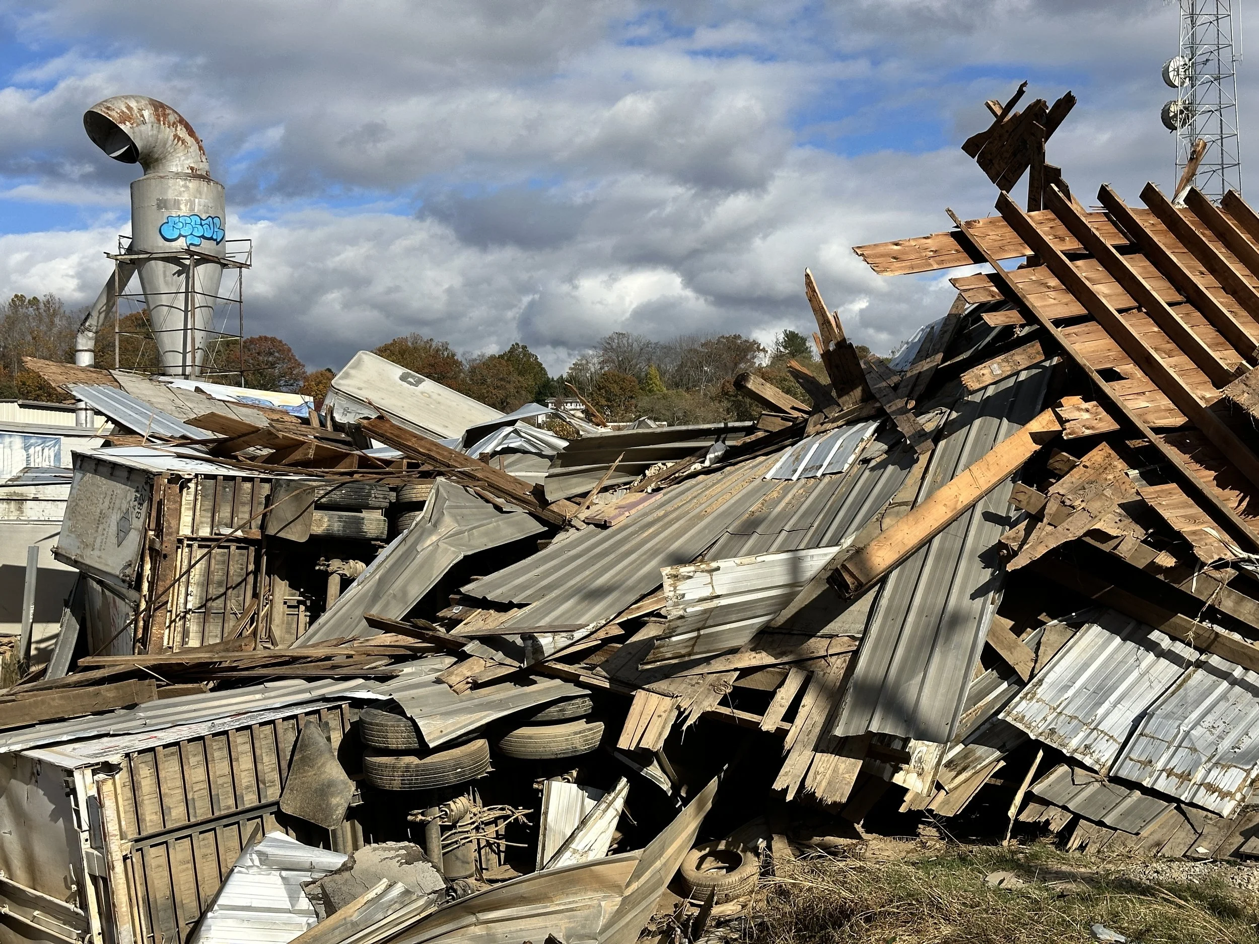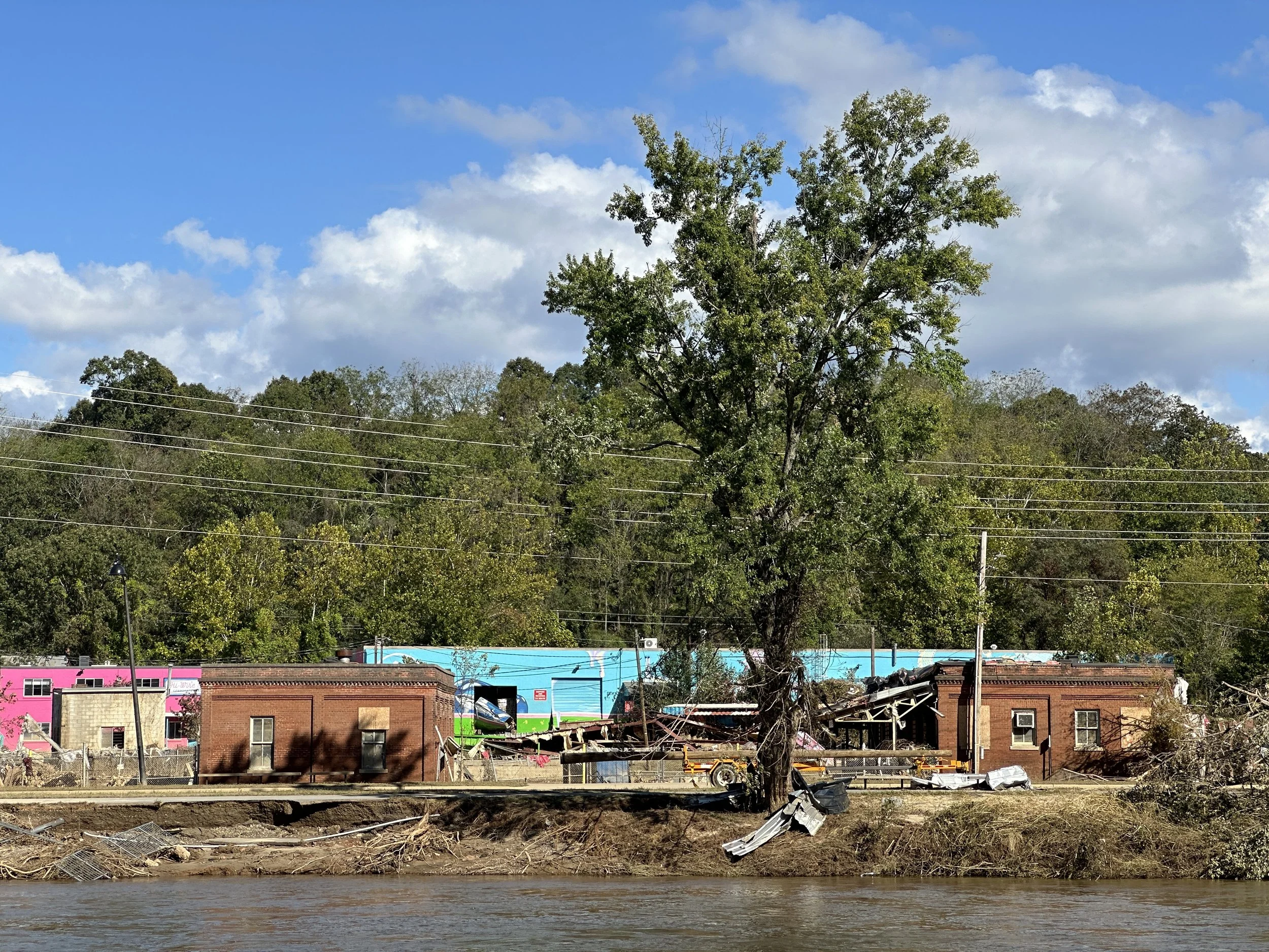 River Arts District after Helene. Second Gear was eventually torn down to foundation a year after the storm and will now be an outdoor skating rink.